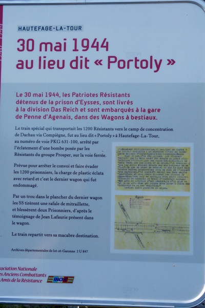 Le train spécial qui transportait les 1200 résistants vers le camp de concentration de Dachau via Compiègne, fut au lieu-dit « Portoly » à Hautefage la Tour, au numéro de voie PKG 631-100, arrêté par l’éclatement d’une bombe posée par les résistants du groupe Prosper sur la voie ferrée.